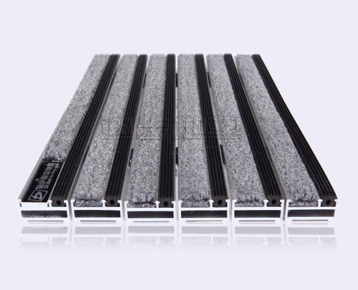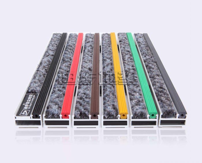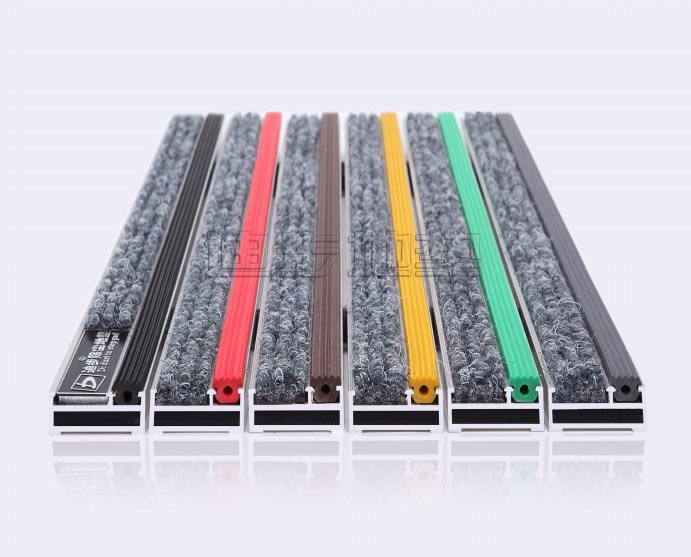 系列铝框架采用Alcoa高精度纯铝耐腐蚀防锈硬质铝合金,侧面高度达到20MM±1,铝合金壁厚为1.0MM-1.5MM-2MM-2.5MM-3.5MM,,其承重力在标准滚动下每平方可达1500kg-2500kg-4000kg-6000kg不变形,承受力强。面料采用毯面:尼龙背衬:发泡背衬结构:簇状圈丝堆积阻燃性:B耐候性:>6级抗静电性能:7.0kv防滑性能:R12总重量:3.5千克/M2/厚度:8.1mm材质 :PVC面料色彩丰富,可根据客户需要灵活搭配。配件:锁扣为Sus304不锈钢锁扣,钢丝为特殊处理的防锈包塑钢丝。底部采用900系统制成两边支撑力大,更能够完美保持地垫的高度一致。地垫放置于高级石材或地砖坑槽内。避免了传统地毯与地面石材的摩擦,能延长石材面板保护膜的寿命同时有效保护地面石材的表面光滑度。